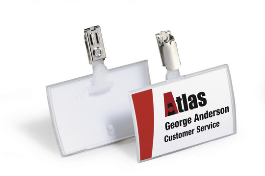 Aufklappbares Namensschild mit Clip. Mit auswechselbarem blanko Einsteckschild. Aus gespritzter PP-Folie.Ein flexibles Filmscharnier hält die Vorder- und Rückseite des einteiligen Namensschildes zusammen und ermöglicht so ein einfaches und schnelles Austauschen des Einsteckschildes.